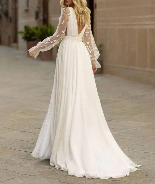 Wholesa A-Line Boho Long Sleeve Flowy Wedding Dress Lace V-Neck Beach Gown with Split Front and Sweep Train