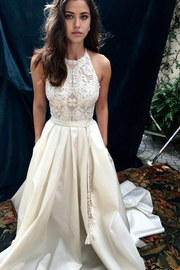 Wholesa A-Line Halter Sweep Train Satin Ivory Wedding Dress with Lace
