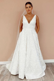 Wholesa A Line Illustion V Neckline Floral Lace Back Court Train Wedding Dress