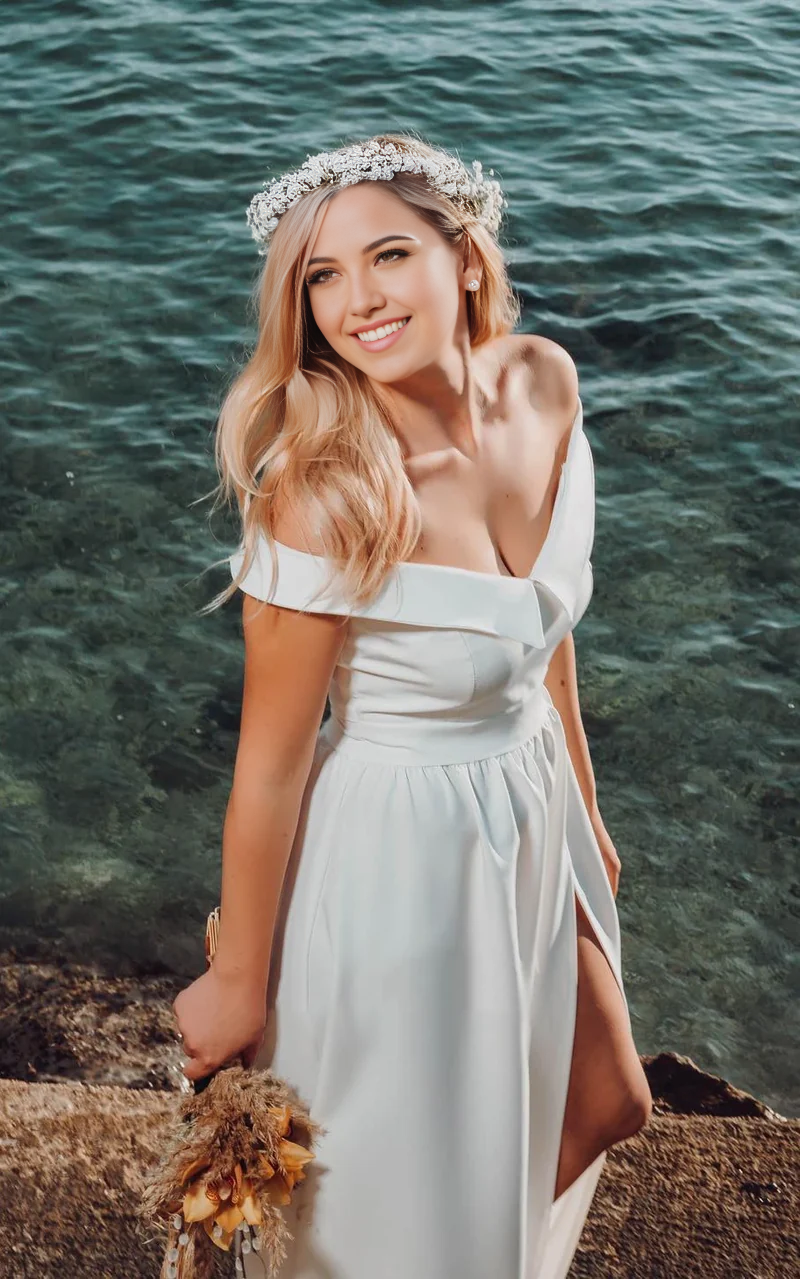 Wholesa A-Line Off-the Shoulder Satin Wedding Dress Sleeveless With Split Front - US 2 / UK 6 / EU 32