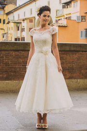 Wholesa A-line Princess Tea-Length Appliqued Tulle Wedding Dresses With Flowers - US 2 / UK 6 / EU 32