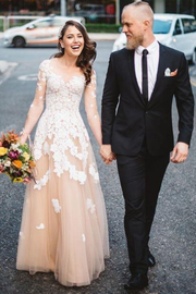 Wholesa A-Line Scoop 3/4 Sleeves Tulle Prom Dress Wedding Dresses with Appliques