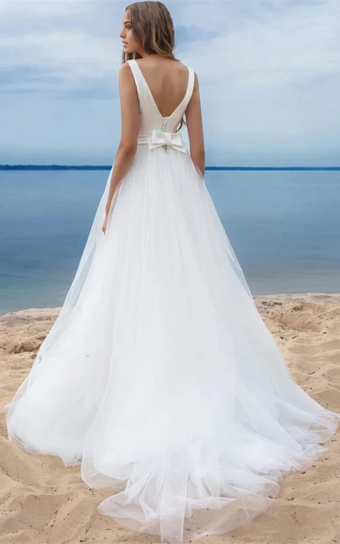 Wholesa A-line Simple Ball Gown Satin Tulle Bateau Sleeveless Wedding Dress With Bow and Ribbon