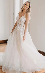 Wholesa A Line V-neck Floor-length Lace Tulle Spaghetti Sleeveless Wedding Dress - US 2 / UK 6 / EU 32