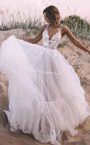 Wholesa A-Line V-neck Lace Tulle Sleeveless Wedding Dress with Appliques