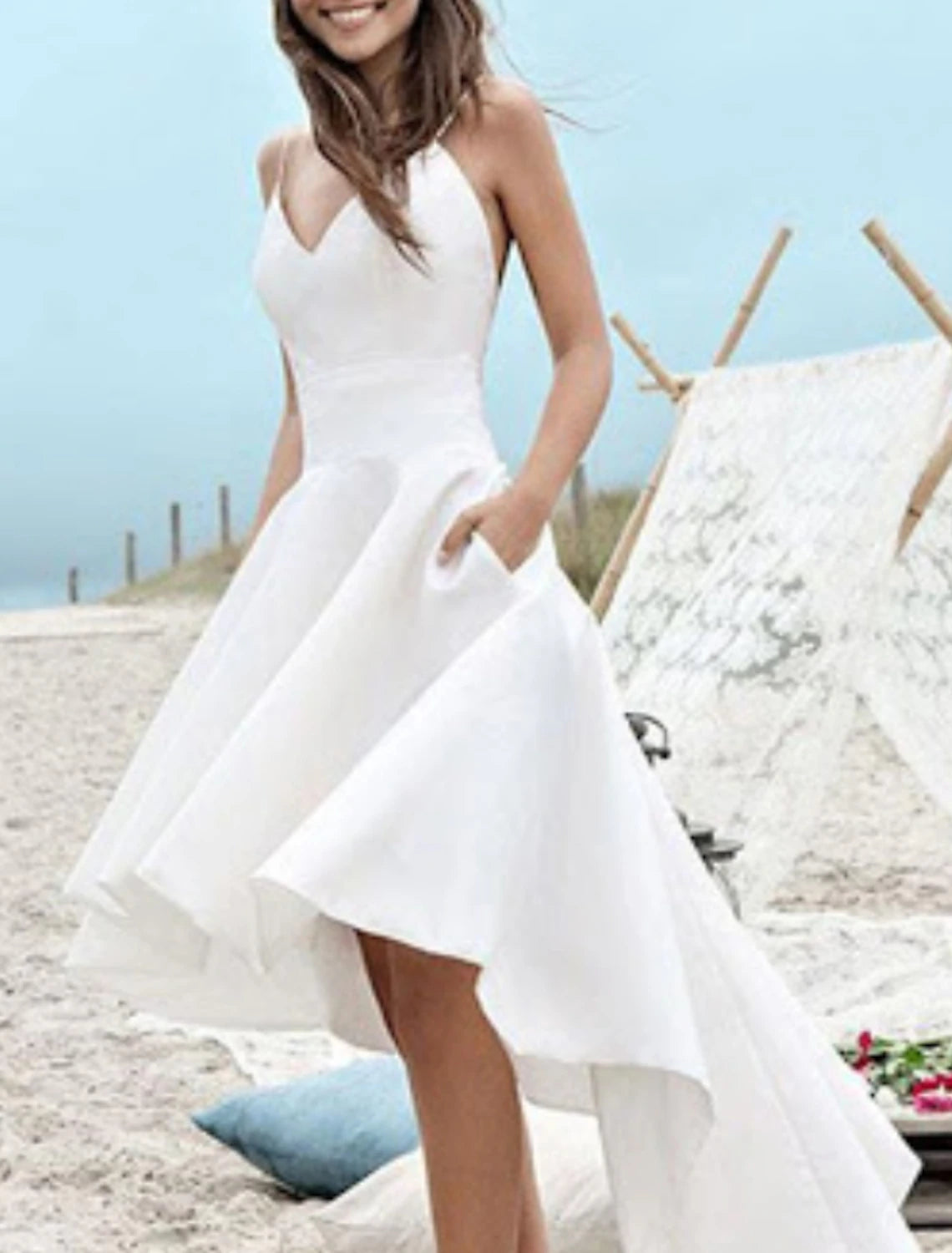 Wholesa Beach Little White Dresses Wedding Dresses A-Line Camisole V Neck Spaghetti Strap Asymmetrical Satin Bridal Gowns With Pleats