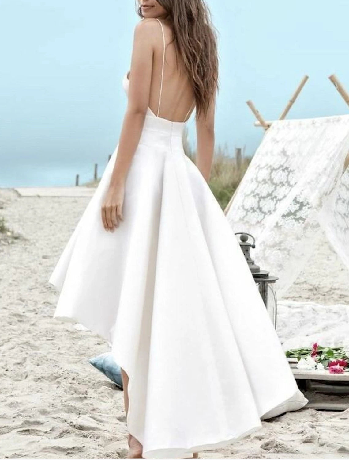 Wholesa Beach Little White Dresses Wedding Dresses A-Line Camisole V Neck Spaghetti Strap Asymmetrical Satin Bridal Gowns With Pleats - US 2 / UK 6 / EU 32