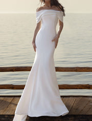 Wholesa Beach Simple Wedding Dresses Mermaid / Trumpet Off Shoulder Cap Sleeve Court Train Satin Bridal Gowns With Ruched - US 2 / UK 6 / EU 32
