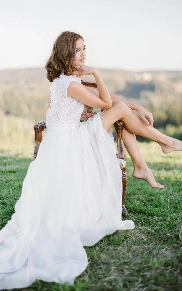 Wholesa Boho Lace Floor-Length Cap Dress Wedding Dresses With Keyhole Back