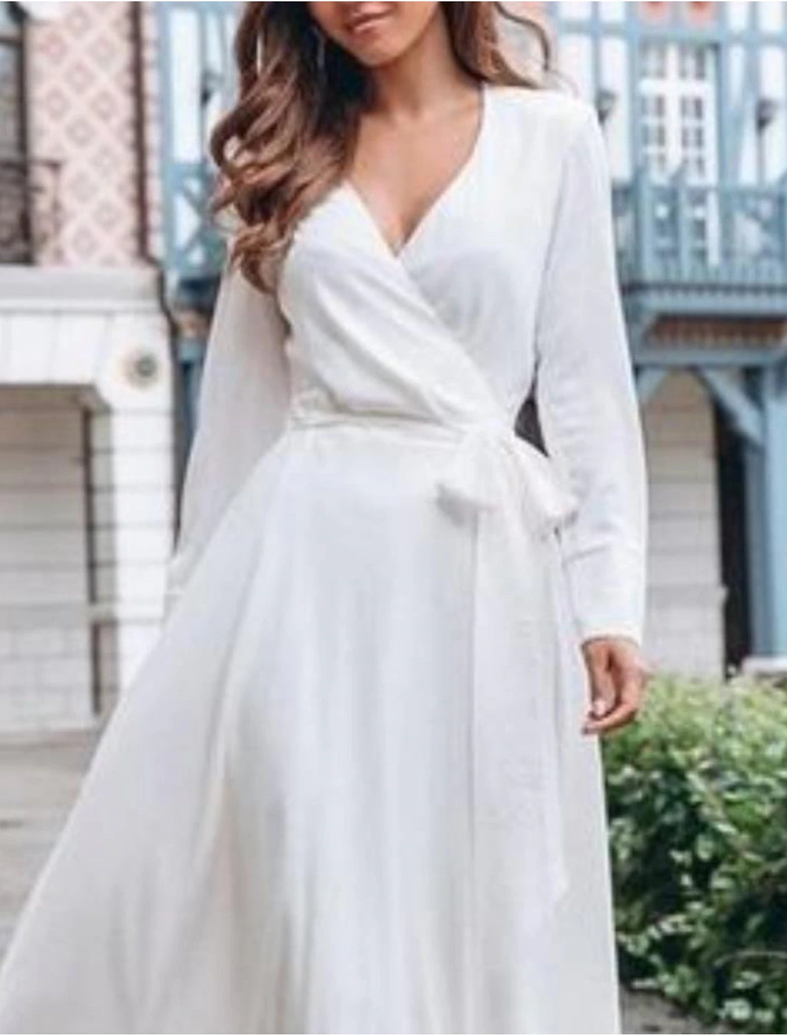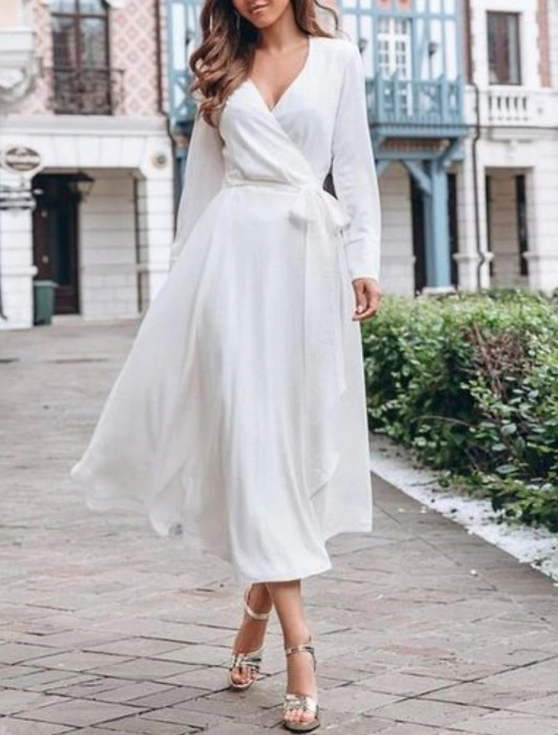 Wholesa Bridal Shower Little White Dresses Wedding Dresses A-Line V Neck Long Sleeve Tea Length Chiffon Bridal Gowns With Bow(s) - US 2 / UK 6 / EU 32
