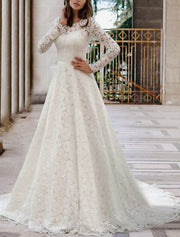 Wholesa Engagement Formal Fall Wedding Dresses A-Line Illusion Neck Long Sleeve Court Train Lace Bridal Gowns With Sashes / Ribbons Pleats