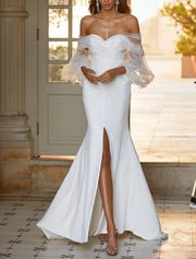Wholesa Hall Casual Wedding Dresses Mermaid / Trumpet Off Shoulder Long Sleeve Sweep / Brush Train Satin Bridal Gowns With Split Front