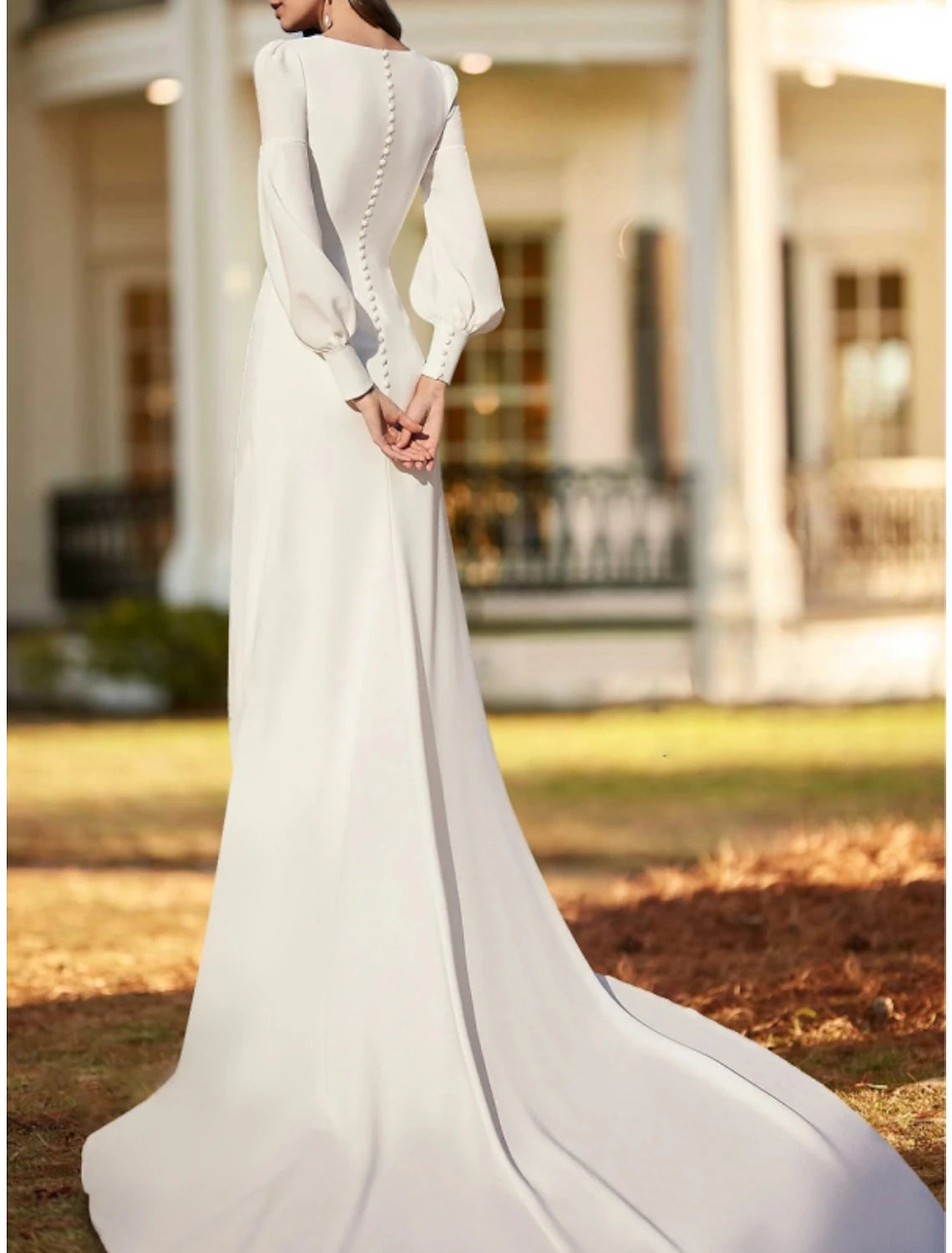 Wholesa Hall Casual Wedding Dresses Sheath / Column Square Neck Long Sleeve Court Train Chiffon Bridal Gowns With Ruched Split Front - US 2 / UK 6 / EU 32