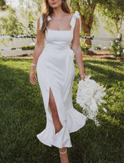 Wholesa Hall Little White Dresses Wedding Dresses Sheath / Column Camisole Sleeveless Tea Length Satin Bridal Gowns With Bow(s) Split Front - US 2 / UK 6 / EU 32