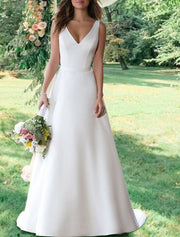 Wholesa  Hall Open Back Casual Wedding Dresses A-Line V Neck Sleeveless Sweep / Brush Train Satin Bridal Gowns With Appliques