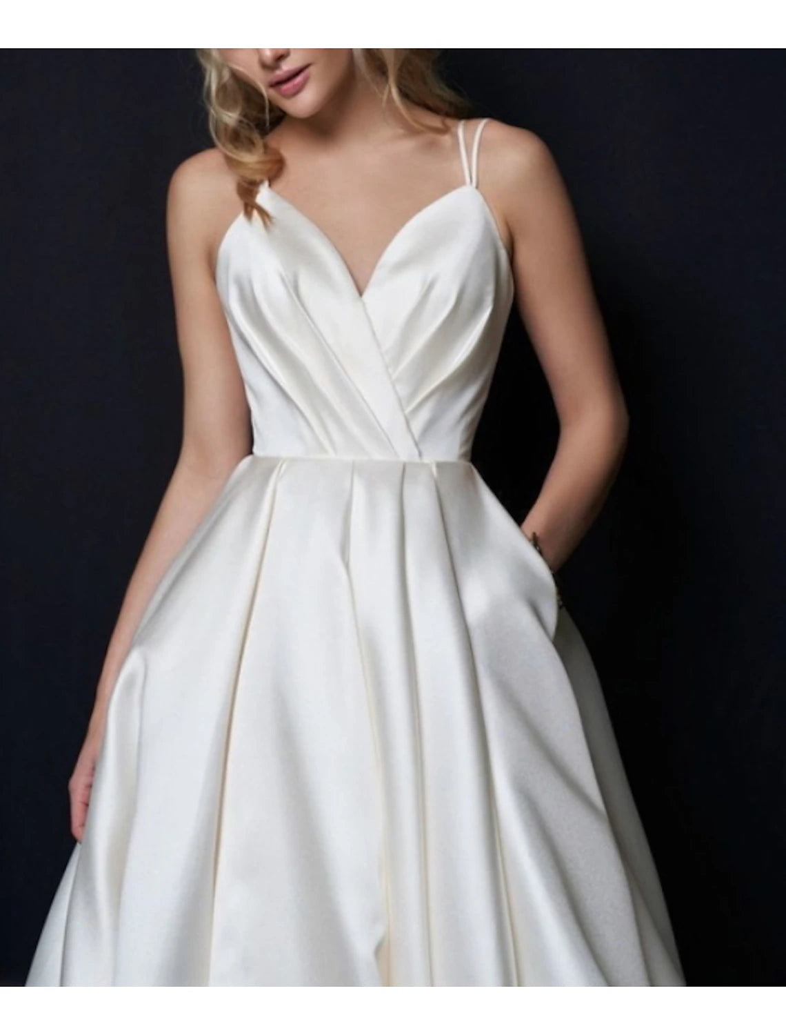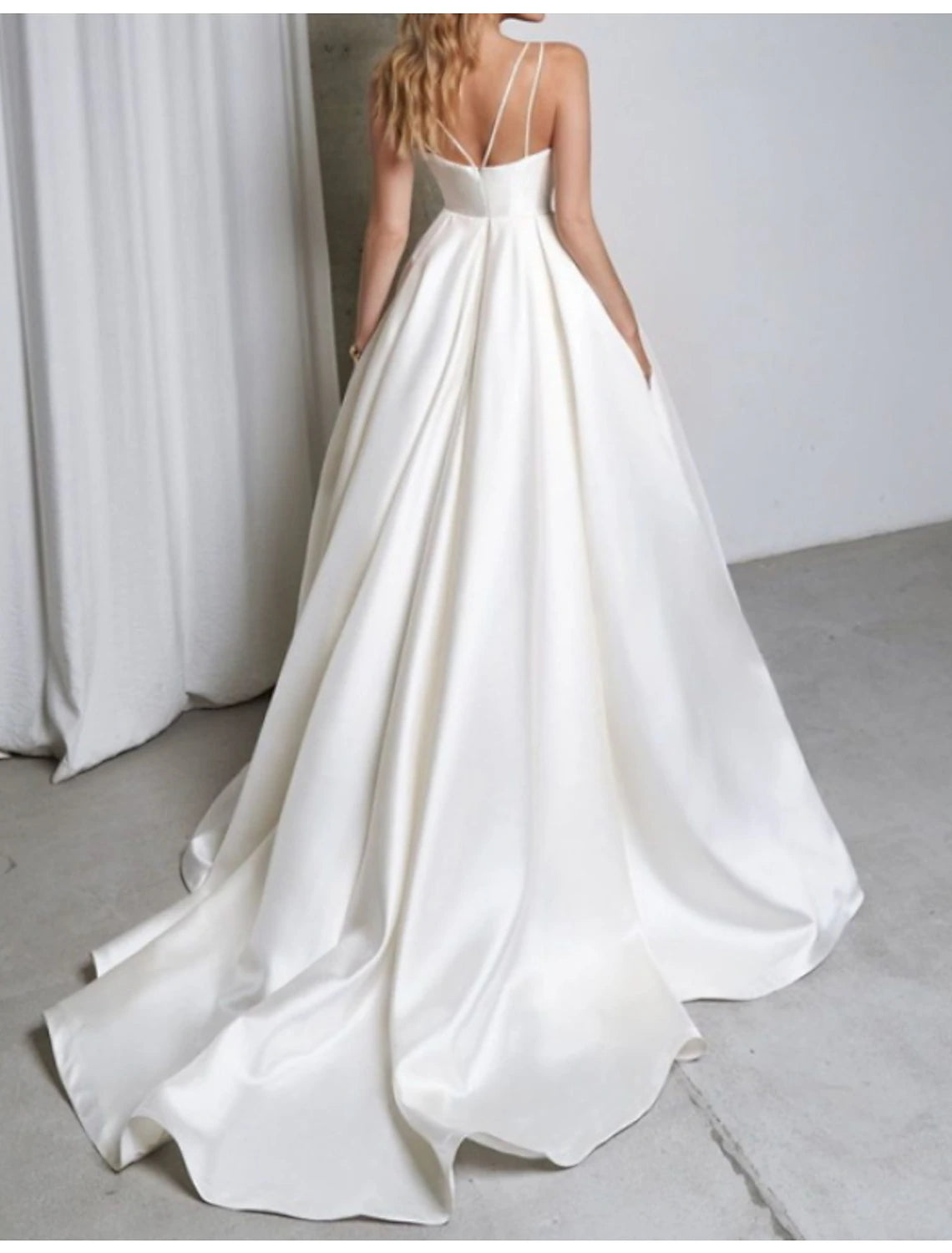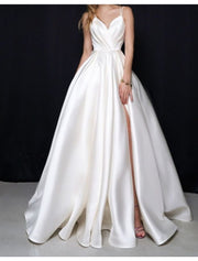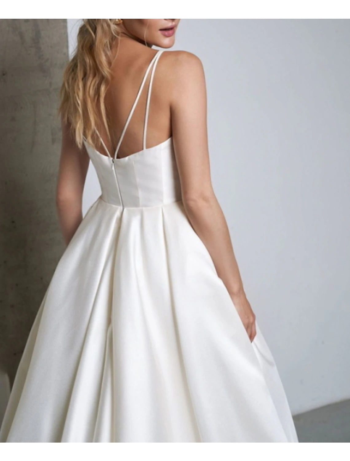 Wholesa Hall Simple Wedding Dresses A-Line Sweetheart Camisole Spaghetti Strap Court Train Satin Bridal Gowns With Pleats Split Front - US 2 / UK 6 / EU 32
