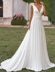 Wholesa Hall Simple Wedding Dresses A-Line V Neck Sleeveless Sweep / Brush Train Chiffon Bridal Gowns With Pleats Pearls