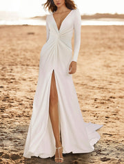 Wholesa Hall Simple Wedding Dresses Sheath / Column V Neck Long Sleeve Court Train Stretch Fabric Bridal Gowns With Ruched Split Front - US 2 / UK 6 / EU 32