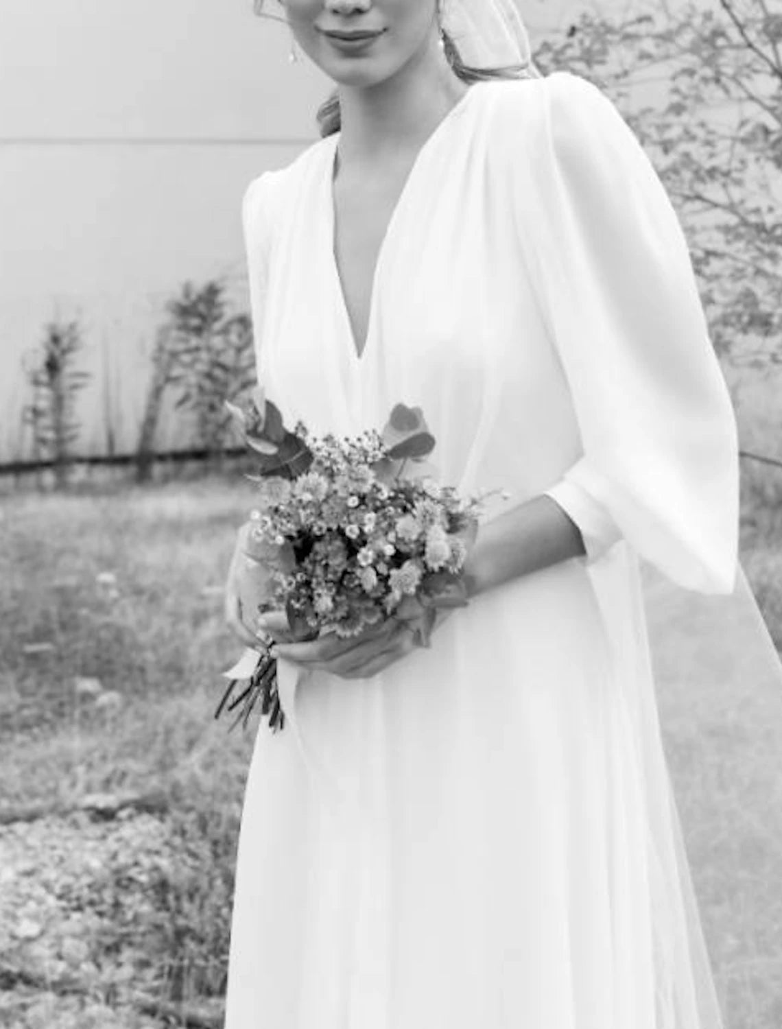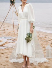 Wholesa Little White Dresses Wedding Dresses A-Line V Neck Half Sleeve Asymmetrical Chiffon Bridal Gowns With Ruched Solid Color