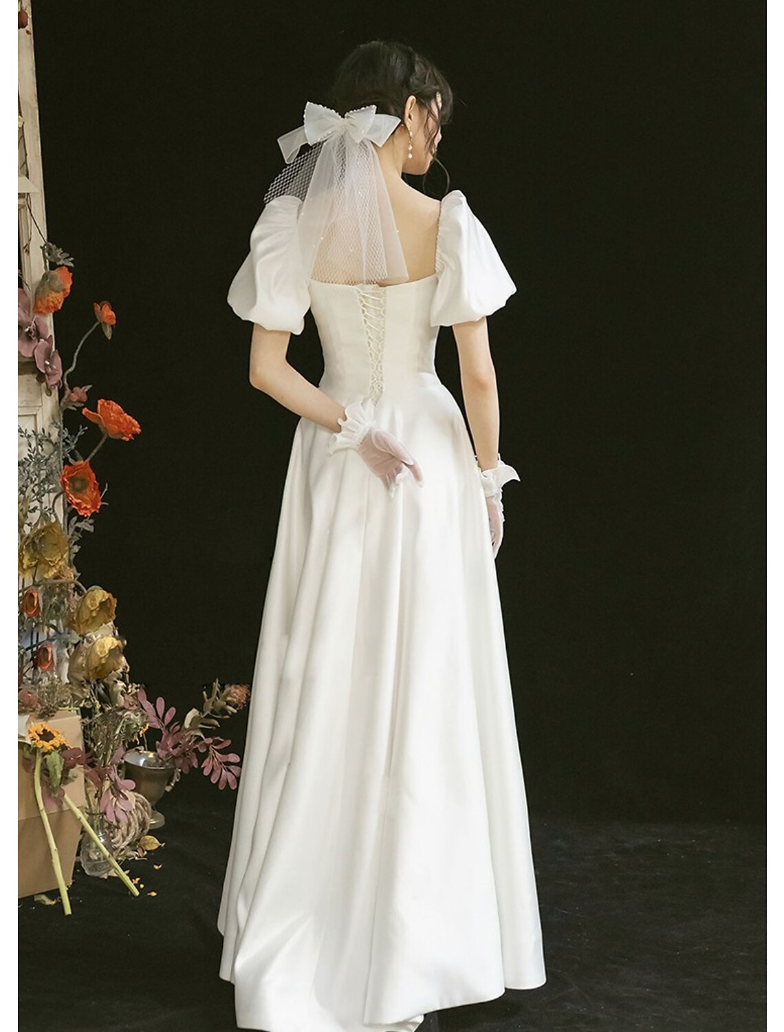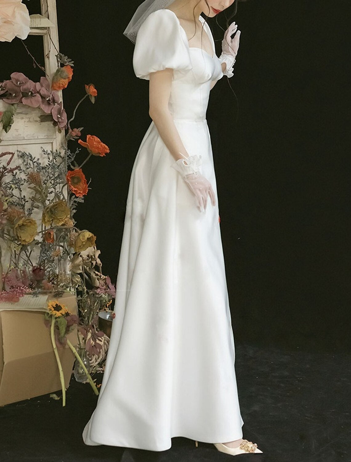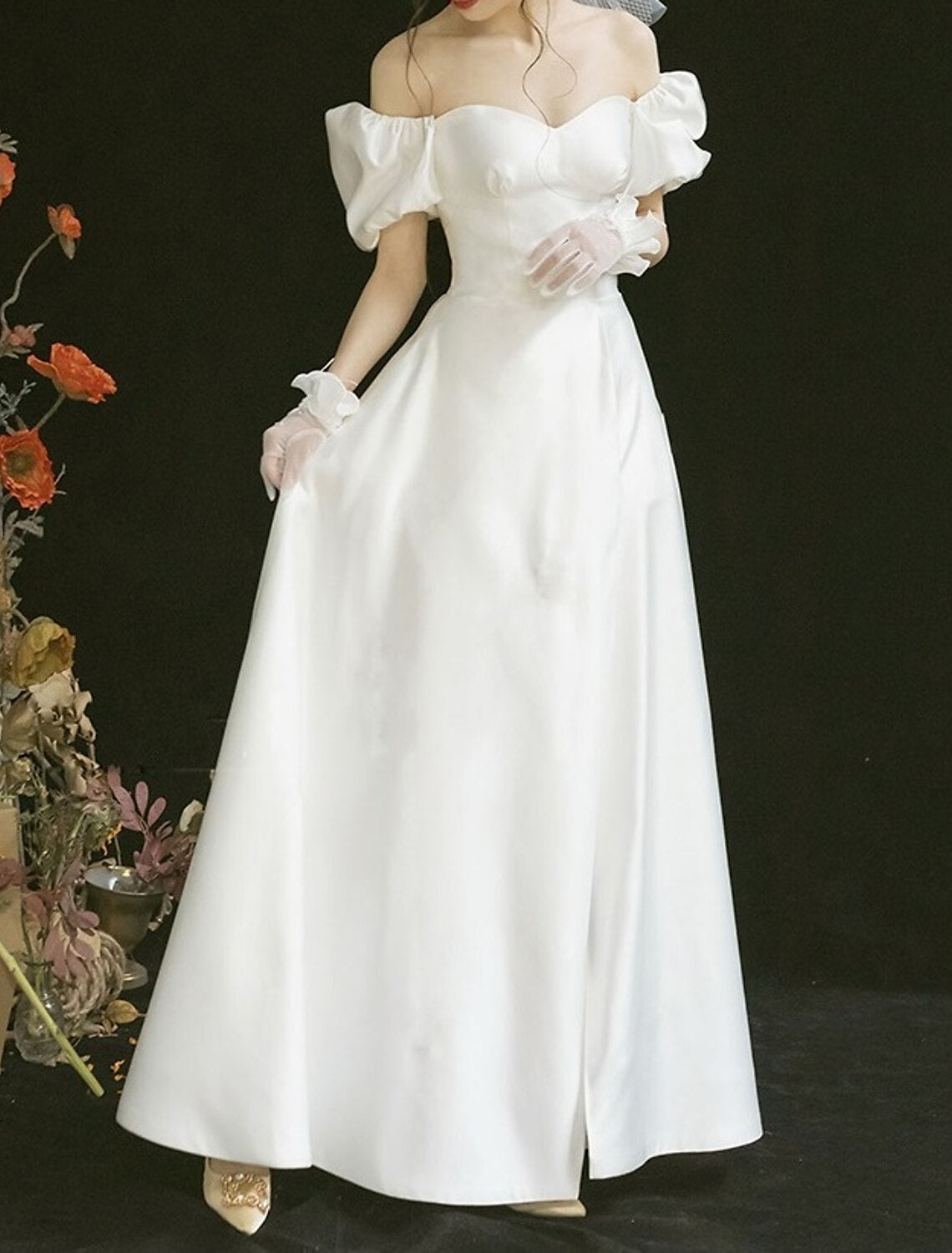 Wholesa Reception Casual Wedding Dresses A-Line Off Shoulder Short Sleeve Floor Length Satin Bridal Gowns With Split Front - US 2 / UK 6 / EU 32