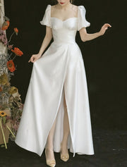 Wholesa Reception Casual Wedding Dresses A-Line Off Shoulder Short Sleeve Floor Length Satin Bridal Gowns With Split Front