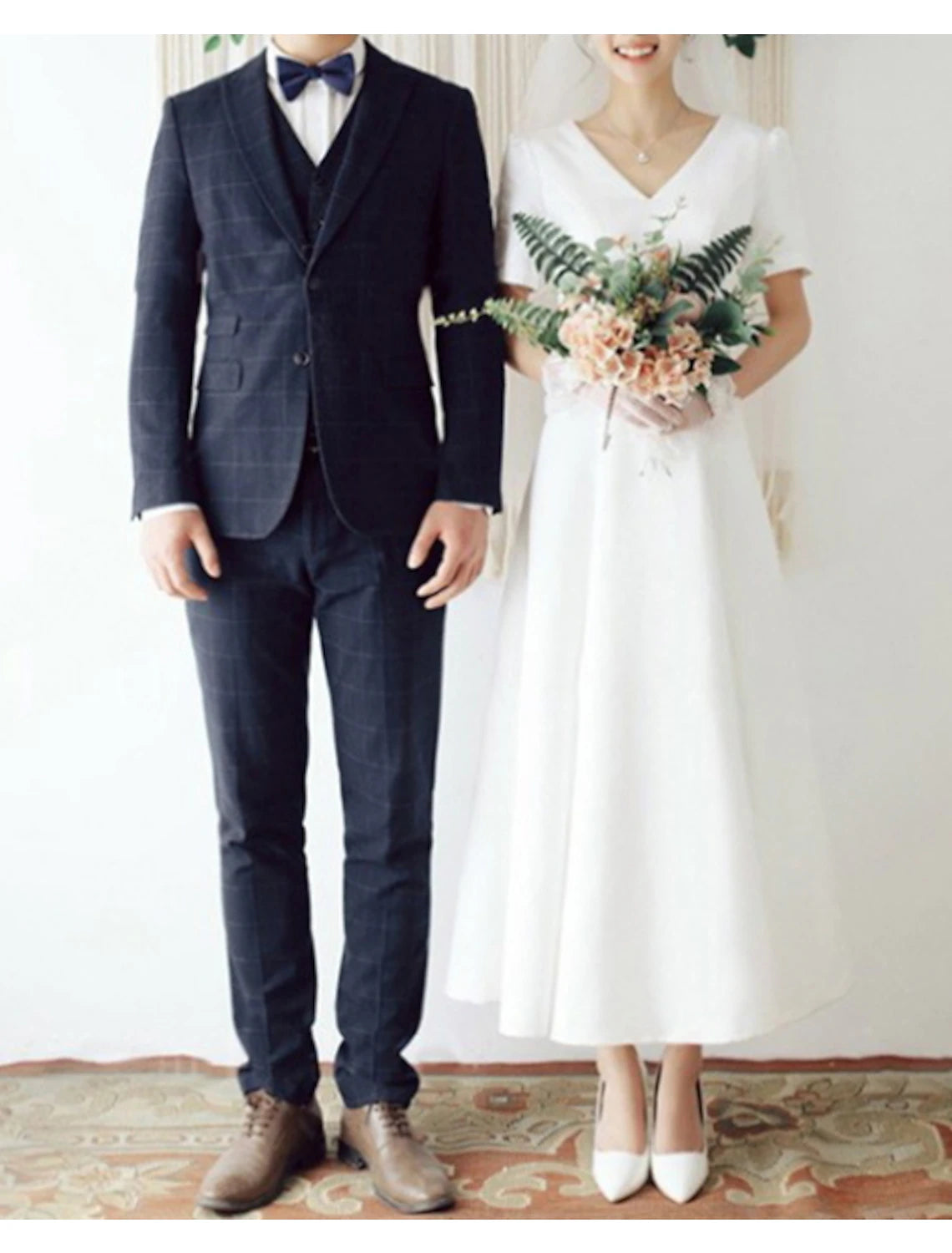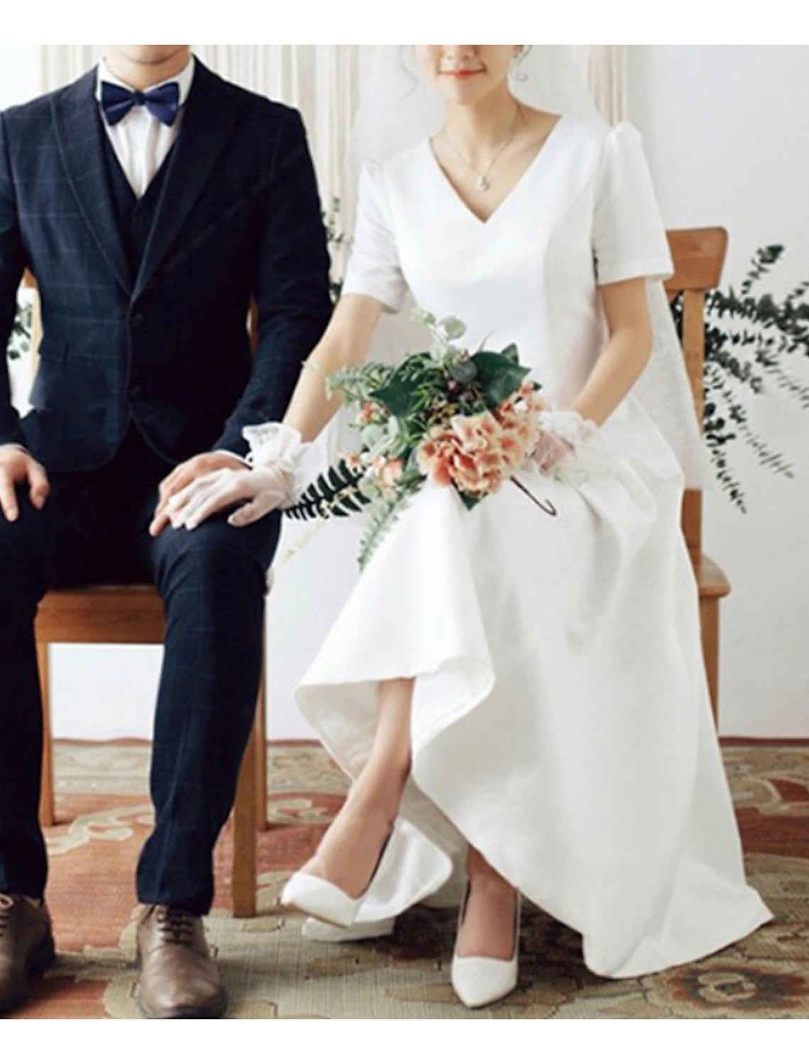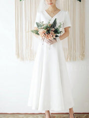 Wholesa Reception Little White Dresses Wedding Dresses A-Line V Neck Short Sleeve Ankle Length Satin Bridal Gowns With Pleats