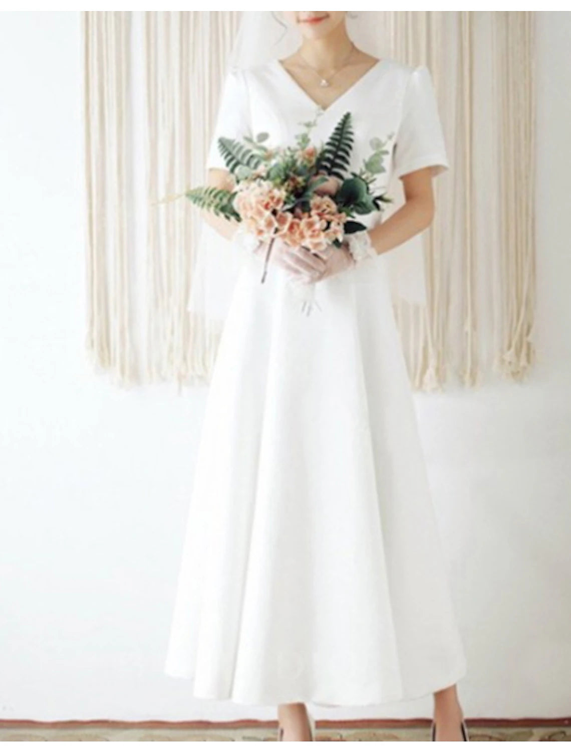 Wholesa Reception Little White Dresses Wedding Dresses A-Line V Neck Short Sleeve Ankle Length Satin Bridal Gowns With Pleats - US 2 / UK 6 / EU 32