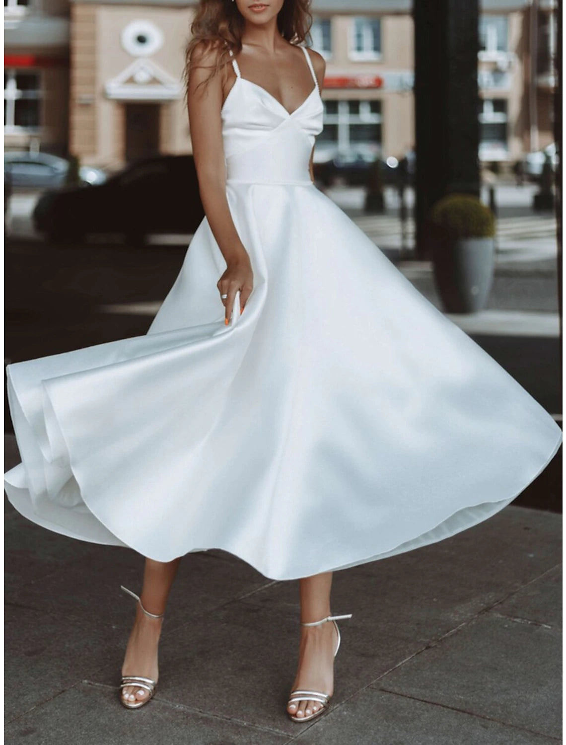 Wholesa Reception Simple Wedding Dresses Wedding Dresses A-Line V Neck Long Sleeve Tea Length Chiffon Bridal Gowns With Pleats - US 2 / UK 6 / EU 32