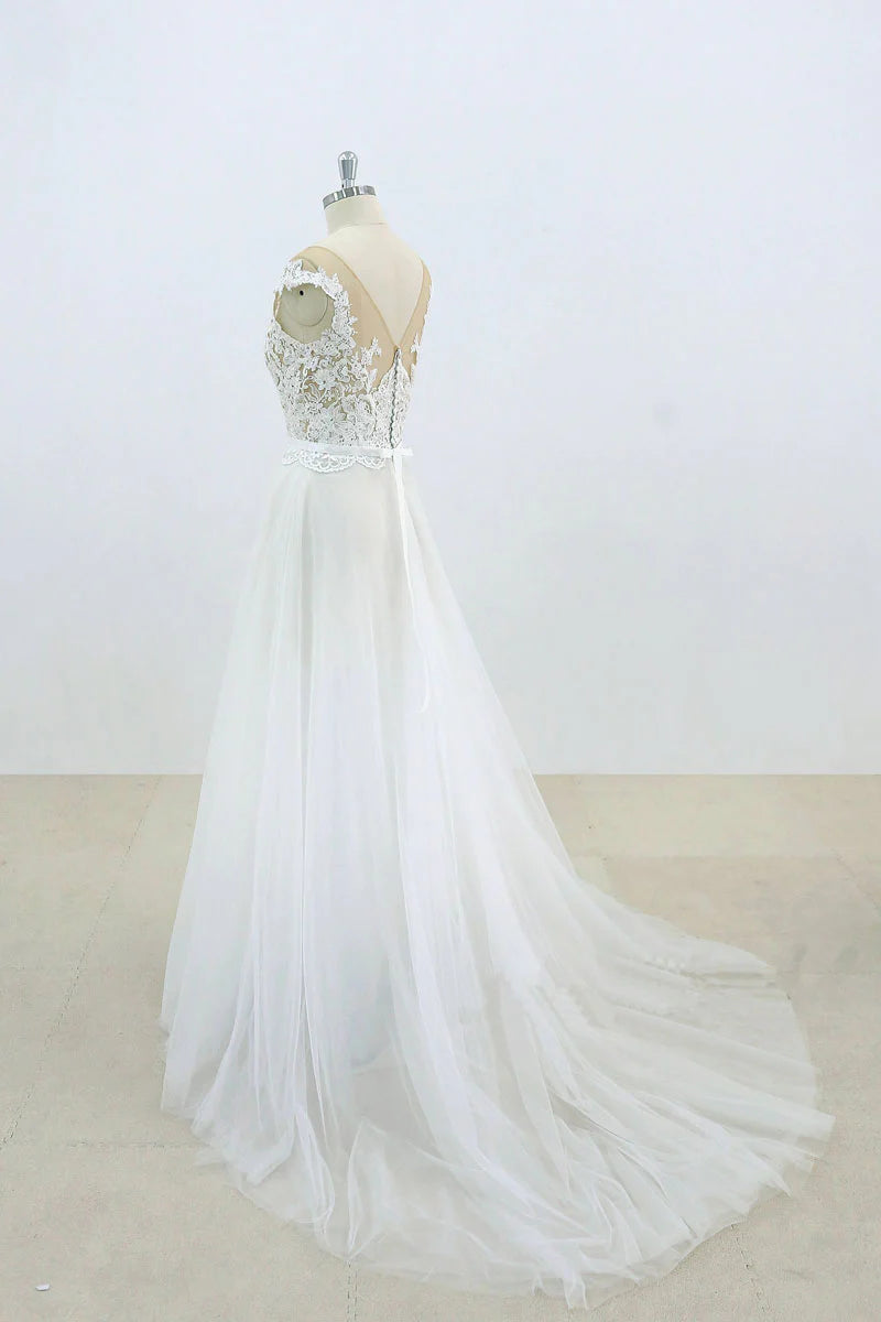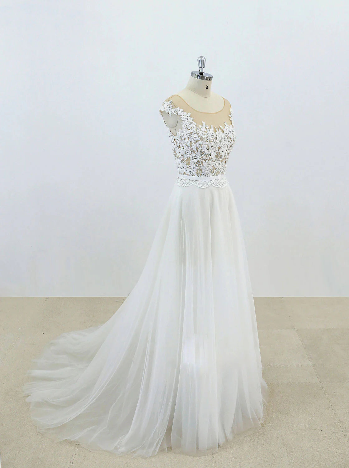 Wholesa Round Neck Lace Tulle Long Wedding Dresses - US 2 / UK 6 / EU 32