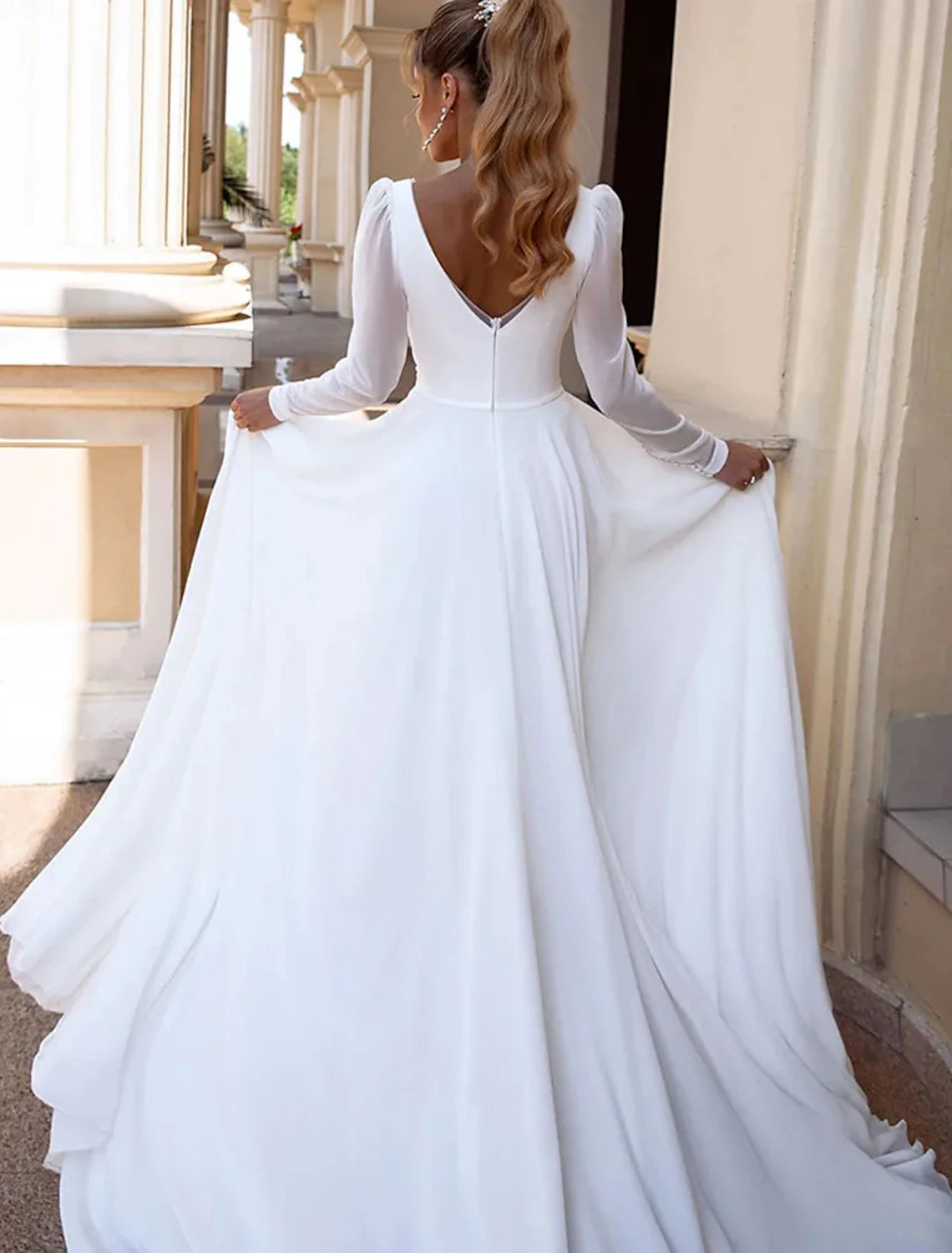 Wholesa Simple Wedding Dresses A-Line V Neck Long Sleeve Floor Length Chiffon Bridal Gowns With Pleats Solid Color - US 2 / UK 6 / EU 32