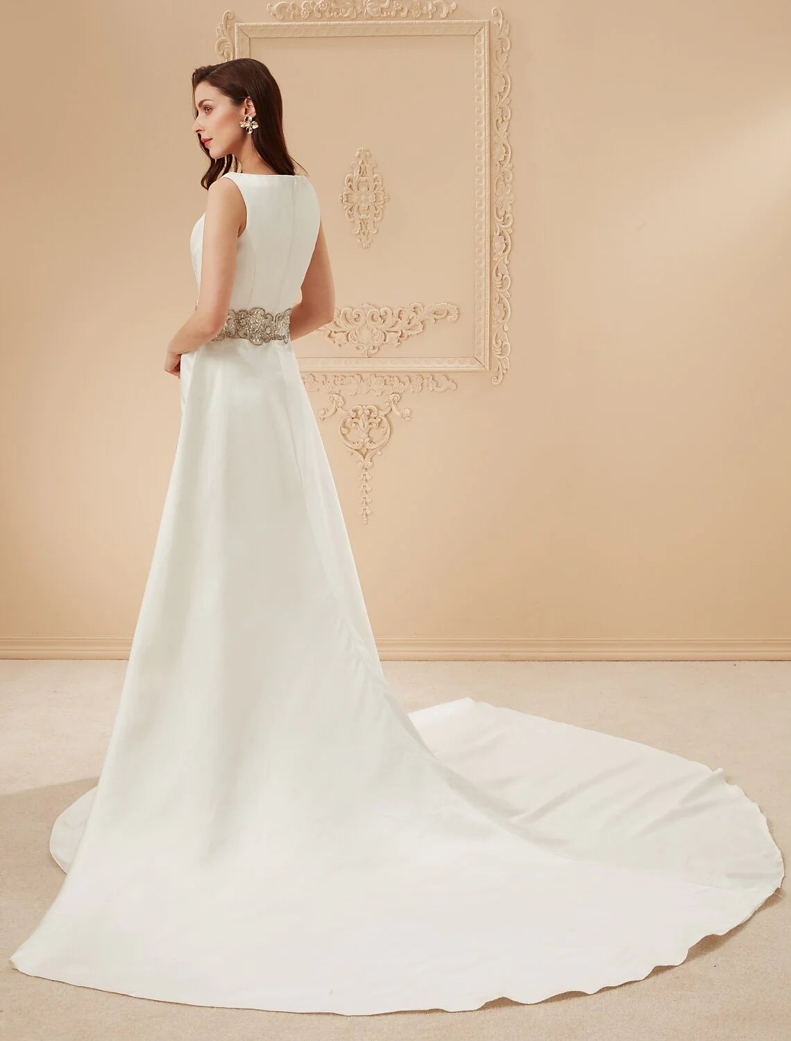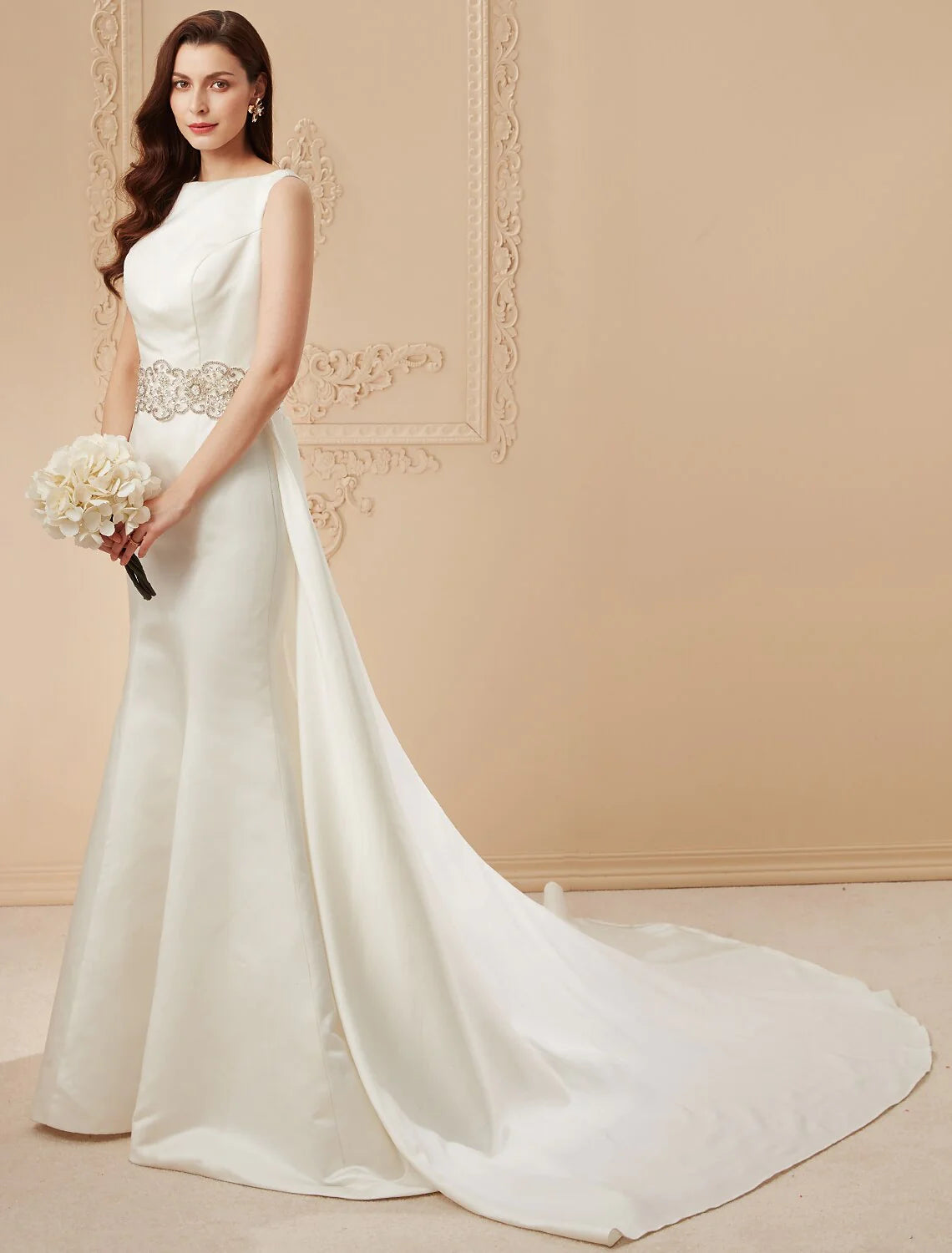 Wholesa Wedding Dresses Chapel Train Mermaid / Trumpet Sleeveless Scoop Neck Satin With Beading - US 2 / UK 6 / EU 32