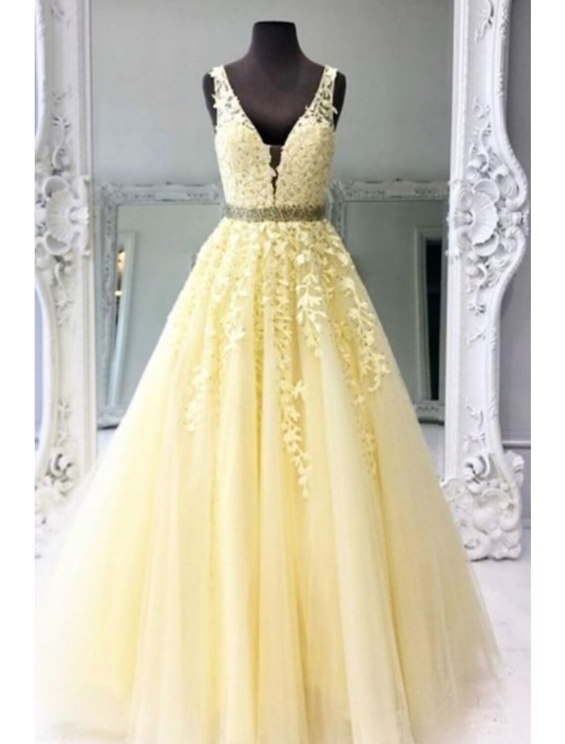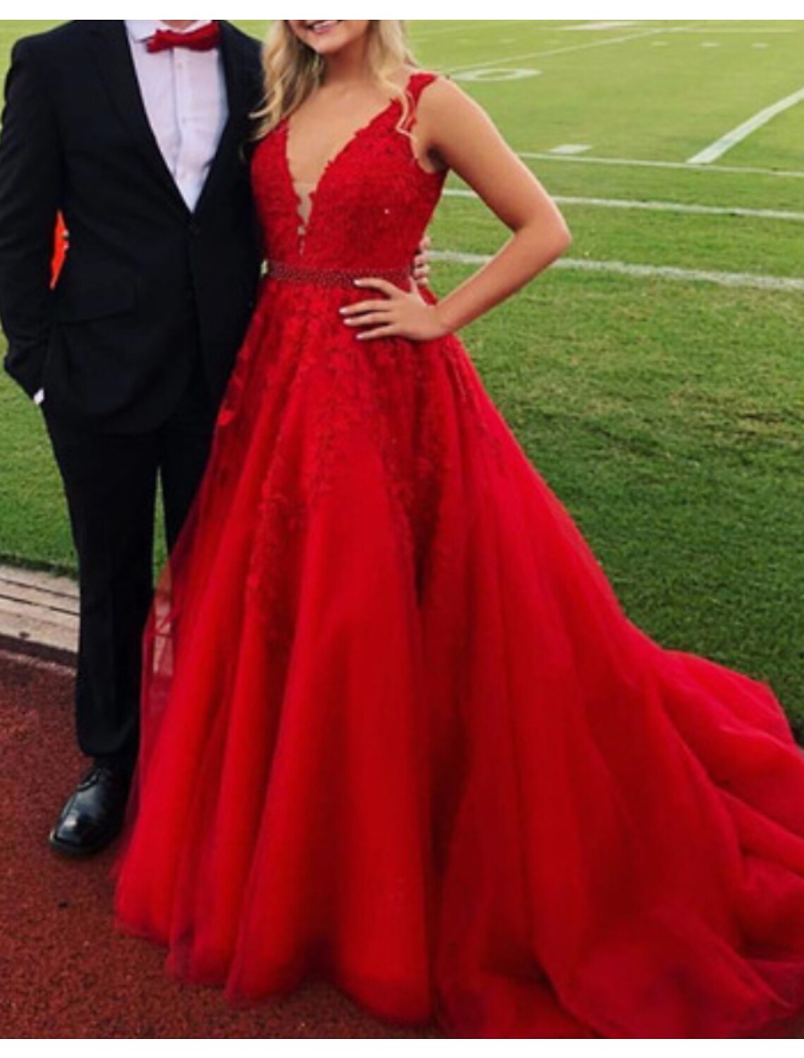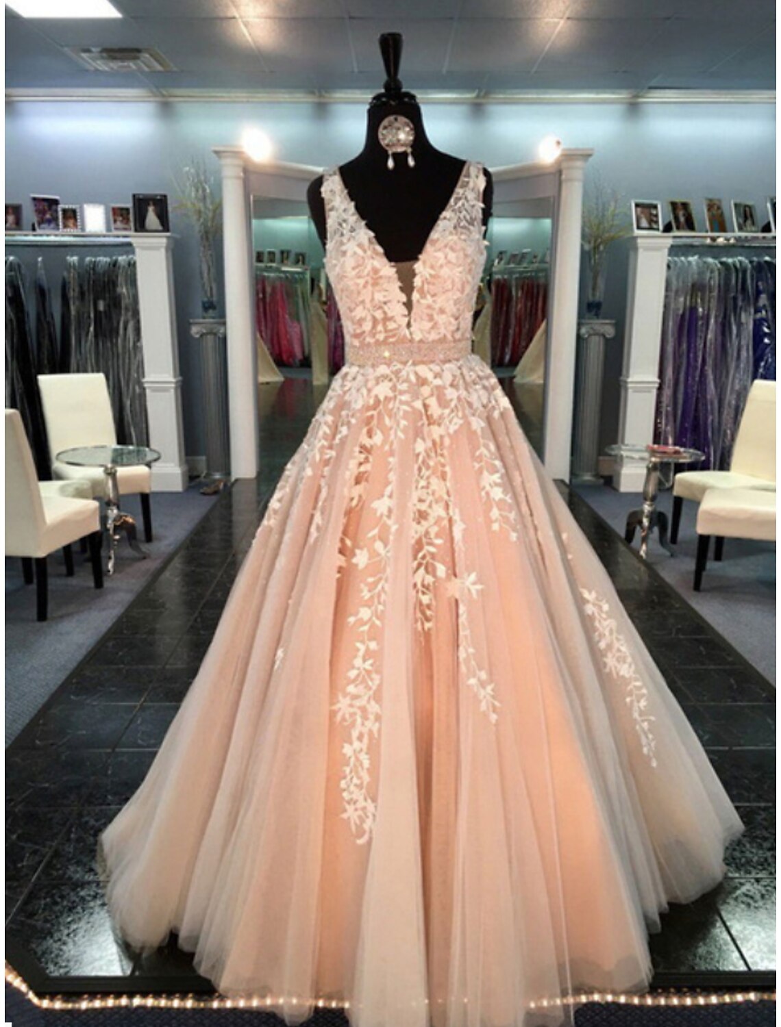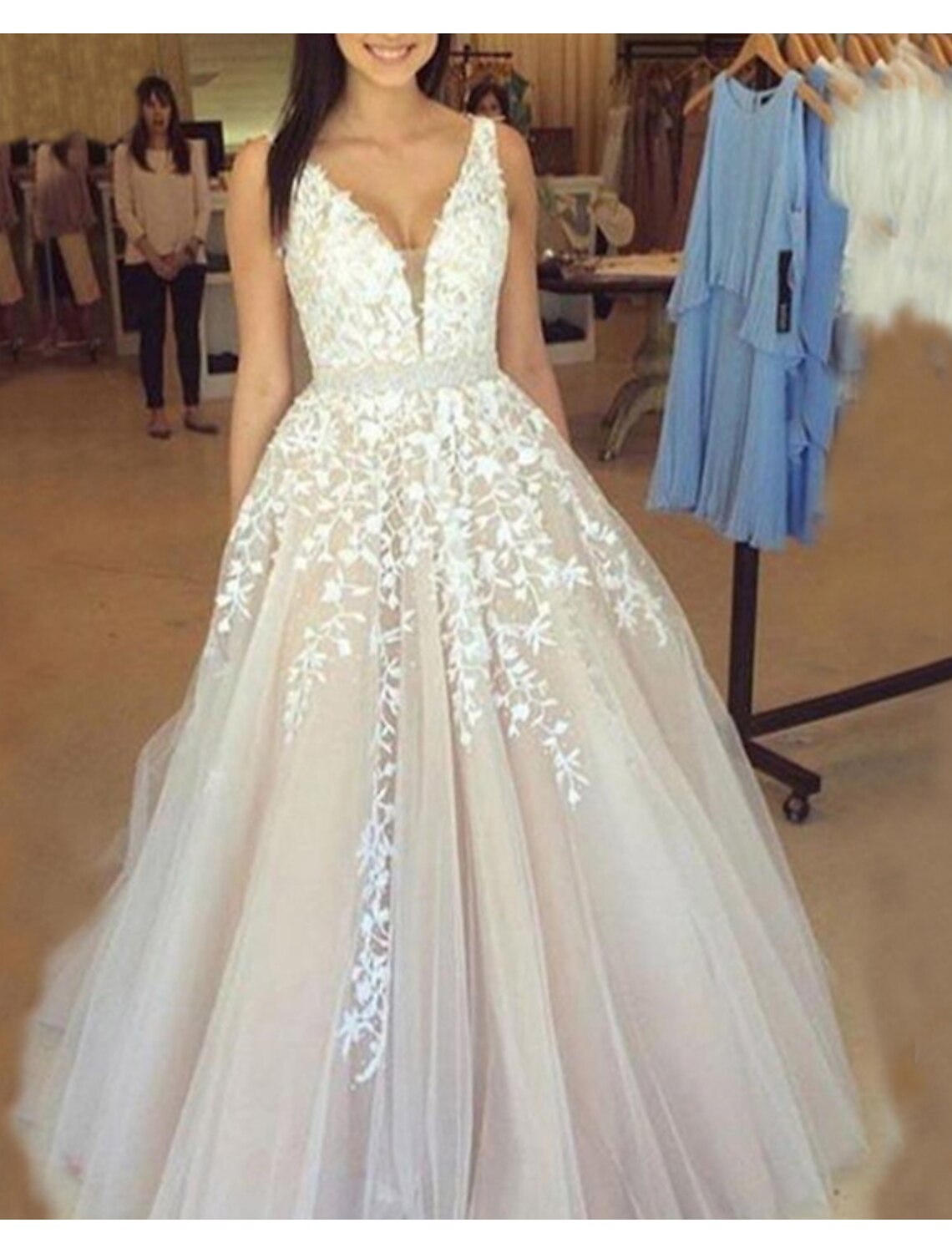 wholesale Engagement Formal Wedding Dresses A-Line V Neck Sleeveless Sweep / Brush Train Lace Bridal Gowns With Appliques - US 2 / UK 6 / EU 32