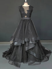 wholesale Engagement Gothic Black Wedding Dresses Formal Fall A-Line Illusion Neck Sleeveless Sweep / Brush Train Lace Bridal Gowns With Appliques Cascading Ruffles Summer Halloween Wedding Party - US 2 / UK 6 / EU 32
