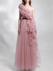 Wholesa A-Line Sleeveless One Shoulder Ruffled Mesh Evening Dresses