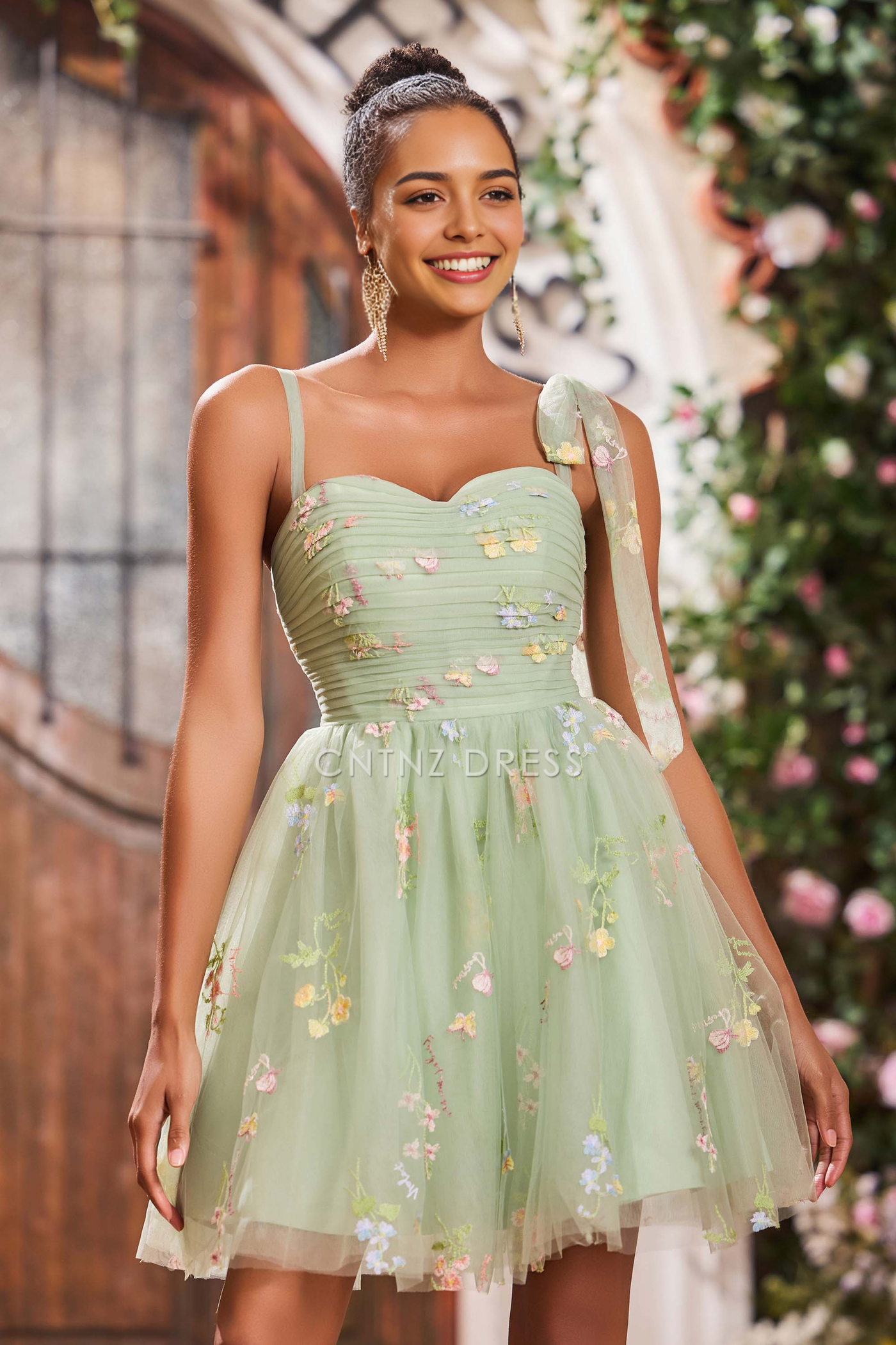 CNTNZ DRESS Fashion A-Line Spaghetti Strap Pleated Applique Bow Straps Knee-Length Cute Dresses Hot Sale Homecoming Dress