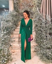 This glamorous prom dress features a sleek sheath silhouette, crafted from rich emerald green satin. It showcases a deep V-neckline with long fitted sleeves, a twisted waist detail to accentuate curves, a sultry high slit for graceful movement, and a hidden zipper back for a seamless fit. The sophisticated elegant design is perfect for prom nights, formal galas, and evening events.