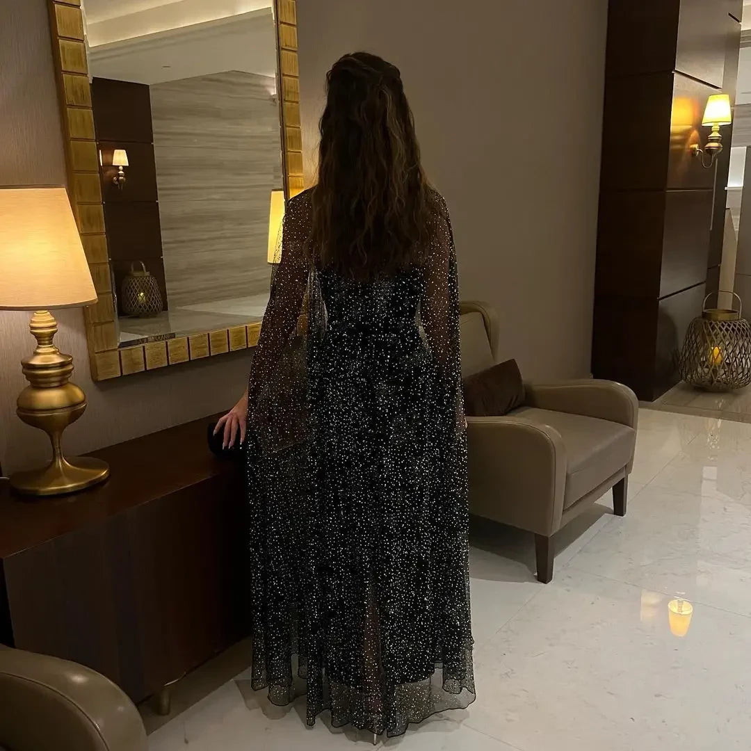 This regal prom dress features a voluminous ball-gown silhouette, crafted from ivory pleated chiffon. It showcases a sheer illusion neckline adorned with sparkling beaded detailing, dramatic flowing cape sleeves made of pleated chiffon, a fitted bodice with a beaded waist belt, and a hidden zipper back for a seamless fit. The sweeping floor-length skirt creates a romantic, ethereal silhouette, perfect for prom nights, formal galas, and wedding events.