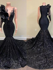 Wholesa Mermaid / Trumpet Evening Gown Floral Dress Formal Chapel Train Long Sleeve One Shoulder African American Sequined with Sequin