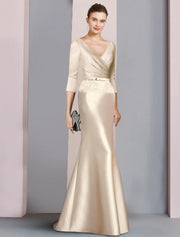 wholesale Sheath / Column Mother of the Bride Dress Wedding Guest Vintage Elegant V Neck Floor Length Satin Lace 3/4 Length Sleeve with Sash / Ribbon Bow(s) - US 2 / UK 6 / EU 32