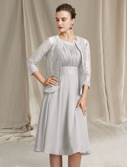 wholesale  Two Piece A-Line Mother of the Bride Dress Church Elegant Jewel Neck Knee Length Chiffon Lace Sleeveless Wrap Included with Pleats Appliques