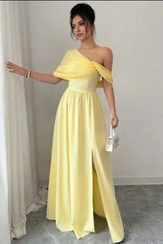 This dress features a fresh yellow color as the main tone and is made of smooth fabric with outstanding drape. The asymmetrical single shoulder design is highly distinctive, with a flowing chiffon ribbon on one side naturally hanging down, cleverly embellishing the shoulder line, and an off shoulder cut on the other side revealing charming collarbone and shoulder neck lines, injecting a touch of casual romance into elegance. The waist cinching design outlines a slender waistline, and the large swing long skirt is paired with a high slit on the side, creating a dynamic and elegant walking experience without losing its small sexiness. Whether it's a light luxury dinner, outdoor party, or romantic date, it can make you the center of attention, perfectly embodying the fusion of gentleness and fashion, like a bright sunshine in spring.